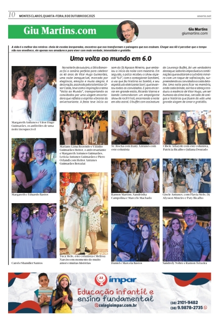 ComentarNa noite 04 de outubro, o Sítio Bonanza foi o cenário perfeito para celebrar os 60 anos de Vitor Hugo Guimarães, uma noite inesquecível, marcada por elegância, emoção e muita alegria. A decoração, assinada pelo talentoso César Costa, teve como inspiração o tema “Volta ao Mundo”, transportando os convidados por uma viagem encantadora que refletia o espírito vibrante do aniversariante. A festa teve início ao som do DJ Alysson Mineiro, que embalou o início da noite com maestria. Em seguida, o palco recebeu o show especial “6.0”, com o contagiante Sandamí, a voz que fez história no Sambô, e seu espetáculo eletrizante San7, que levantou todos os convidados. E para encerrar em grande estilo, Ricardo Vianna e banda comandaram um empolgante show de rock’n’roll, encerrando a noite em alto astral. O buffet com assinatura de Lourenço Buffet, foi um verdadeiro destaque: sabores impecáveis e combinações que exaltaram a culinária mineira com um toque de sofisticação, surpreendendo os convidados a cada detalhe. Uma noite para ficar na memória, onde cada brinde, sorriso e abraço traduziu a essência de Vitor Hugo, um ser humano de alma leve, cercado de amigos e histórias que fazem da vida uma grande viagem de amor e gratidão.