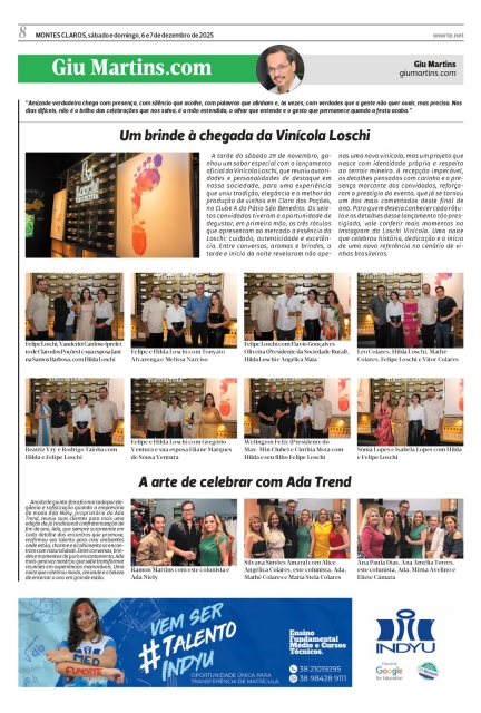 A tarde do sábado 29 de novembro, ganhou um sabor especial com o lançamento oficial da Vinícola Loschi, que reuniu autoridades e personalidades de destaque em nossa sociedade, para uma experiência que uniu tradição, elegância e o melhor da produção de vinhos em Claro dos Poções, no Clube A do Pátio São Benedito. Os seletos convidados tiveram a oportunidade de degustar, em primeira mão, os três rótulos que apresentam ao mercado a essência da Loschi: cuidado, autenticidade e excelência. Entre conversas, aromas e brindes, a tarde e inicio da noite revelaram não apenas uma nova vinícola, mas um projeto que nasce com identidade própria e respeito ao terroir mineiro. A recepção impecável, os detalhes pensados com carinho e a presença marcante dos convidados, reforçaram o prestígio do evento, que já se tornou um dos mais comentados deste final de ano. Para quem deseja conhecer cada rótulo e os detalhes desse lançamento tão prestigiado, vale conferir mais momentos no Instagram da Loschi Vinícola. Uma noite que celebrou história, dedicação e o início de uma nova referência no cenário de vinhos brasileiros.