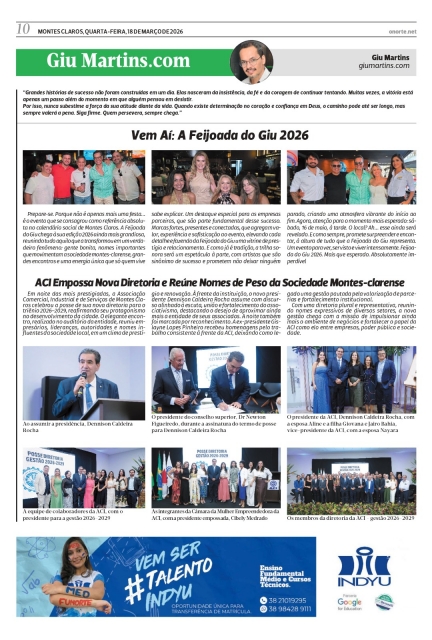 Em noite das mais prestigiadas, a Associação Comercial, Industrial e de Serviços de Montes Claros celebrou a posse de sua nova diretoria para o triênio 2026–2029, reafirmando seu protagonismo no desenvolvimento da cidade. O elegante encontro, realizado no auditório da entidade, reuniu empresários, lideranças, autoridades e nomes influentes da sociedade local, em um clima de prestígio e renovação. À frente da instituição, o novo presidente Dennison Caldeira Rocha assume com discurso alinhado à escuta, união e fortalecimento do associativismo, destacando o desejo de aproximar ainda mais a entidade de seus associados. A noite também foi marcada por reconhecimento. A ex-presidente Gislayne Lopes Pinheiro recebeu homenagens pelo trabalho consistente à frente da ACI, deixando como legado uma gestão pautada pela valorização de parcerias e fortalecimento institucional. Com uma diretoria plural e representativa, reunindo nomes expressivos de diversos setores, a nova gestão chega com a missão de impulsionar ainda mais o ambiente de negócios e fortalecer o papel da ACI como elo entre empresas, poder público e sociedade.