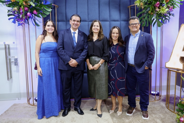 O presidente da ACI, Dennison Caldeira Rocha, com a esposa Aline e a filha Giovana e Jairo Bahia, vice-presidente da ACI, com a esposa Nayara