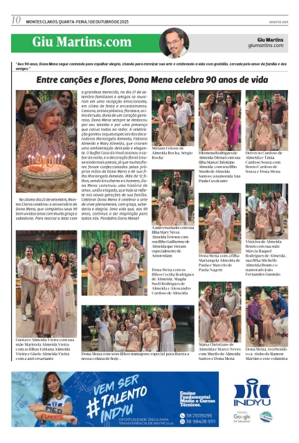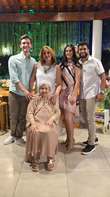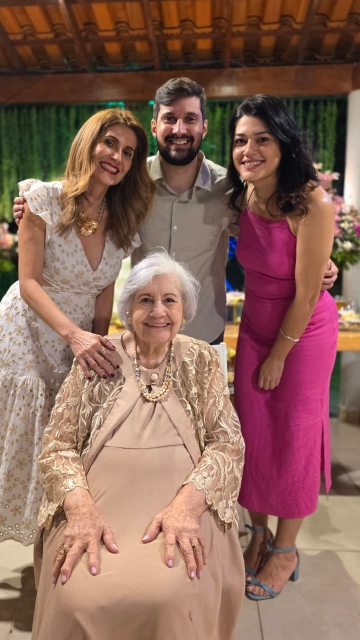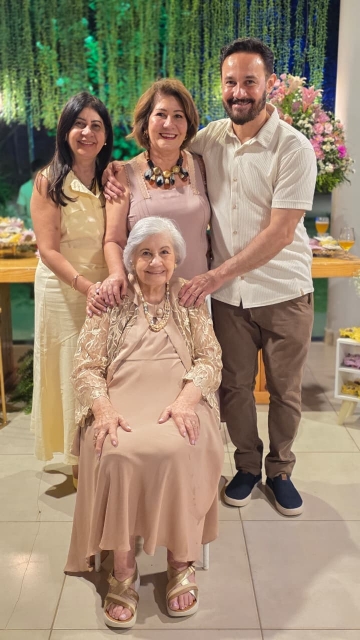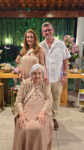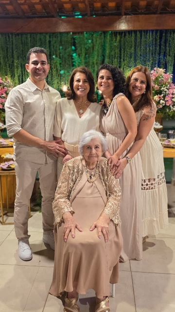 ComentarNo último dia 23 de setembro, Montes Claros celebrou o aniversário de Dona Mena, que completou seus 90 bem vividos anos com muita graça e sabedoria. Para marcar a data com a grandeza merecida, no dia 27 de setembro familiares e amigos se reuniram em uma recepção emocionante, em clima de festa e encantamento. Cantora, artista plástica, florista e, acima de tudo, dona de um coração generoso, Dona Mena sempre se destacou por seu talento e por uma presença que cativa todos ao redor. A celebração ganhou toques especiais das decoradoras Mariangela Almeida, Fabiana Almeida e Mary Almeida, que criaram uma ambientação delicada e elegante. O Buffet Casa do Vovô assinou o sabor da noite, e a decoração floral trouxe ainda mais poesia, já que muitas flores foram confeccionadas pelas próprias mãos de Dona Mena e de sua filha Mariangela Almeida. Mãe de 12 filhos, sendo 8 mulheres e 4 homens, Dona Mena construiu uma história de amor, união e legado, que hoje se reflete nas novas gerações de sua família. Celebrar Dona Mena é celebrar a arte de viver plenamente, com graça, sabedoria e alegria. Uma vida que, aos 90 anos, continua a ser inspiração para todos nós. Parabéns Dona Mena!!