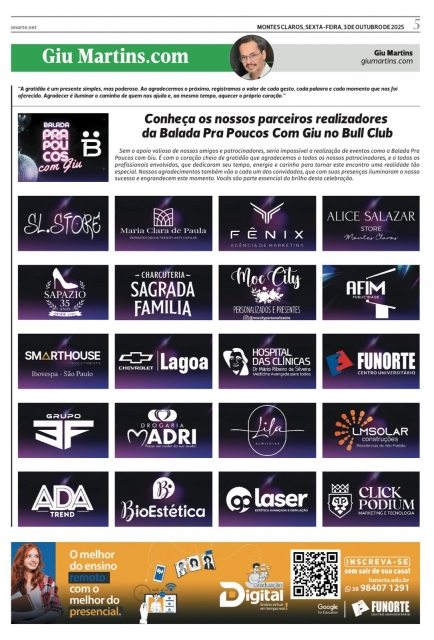 Depois do sucesso da Feijoada do Giu, vem aí mais uma experiência inesquecível: a Balada Pra Poucos com Giu, no próximo 03 de outubro, apartir das 21 horas, em um clima intimista e cheio de energia! A noite será embalada pelos clássicos que marcaram gerações, trazendo muita nostalgia e animação: DJ Nekko estará comandando a pista com os maiores hits dos anos 80 & 90 e o Show “Let’s Dance” com a cantora Lívia Lopes e sua banda, em uma apresentação vibrante promete colocar todo mundo para dançar! Importante: A Balada Pra Poucos é um evento fechado e particular. Não haverá bilheteria na noite. O espaço Bull será apenas o cenário escolhido para a realização da festa, que inclusive está disponível para locações de casamentos, 15 anos e eventos corporativos. Os convites são limitados e a procura já começou! Garanta o seu antecipadamente e venha viver essa noite única, cheia de nostalgia, estilo e boas vibrações. Mais informações: 38 991871000
