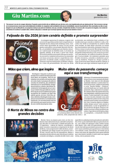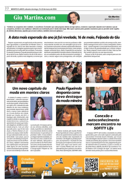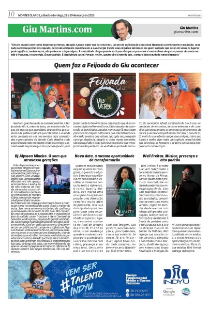Prepare-se para mais um capítulo de um dos eventos mais aguardados e comentados de Montes Claros. A Feijoada do Giu 2026 já tem data marcada e começa, oficialmente, a contagem regressiva para viver uma experiência que vai muito além de uma festa. É encontro, é conexão, é presença. É aquele momento em que a cidade se reúne no seu melhor cenário. No dia 16 de maio, a partir da tarde, o público mais elegante, os nomes que movimentam a cena social e as marcas que fazem a diferença estarão reunidos em uma atmosfera que já se tornou assinatura do evento: vibrante, sofisticada e absolutamente inesquecível. As empresas parceiras, como sempre, chegam somando força, estilo e experiências exclusivas, elevando cada detalhe e transformando a Feijoada do Giu em um verdadeiro palco de relacionamento e prestígio. E claro, a música segue como protagonista, com atrações que prometem embalar o público do começo ao fim, mantendo a energia lá em cima e o clima contagiante. Sobre o local… ainda é segredo. E como toda boa expectativa, vem aí algo à altura da grandiosidade que o evento conquistou. Anote, prepare o look e entre no clima. Vista sua melhor versão e permita-se viver esse encontro.